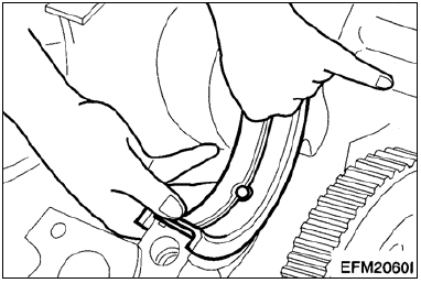� 將主軸承裝入氣缸體內(nèi)并用發(fā)動機油涂抹主軸承。然后將有孔的軸承裝入氣缸體側(cè)壁,無孔的軸承裝入軸承蓋,小心不要弄混。