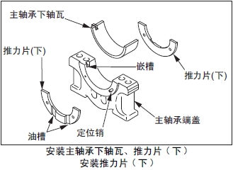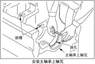 (3) 主軸承上軸瓦對準曲軸箱的嵌槽后安裝。