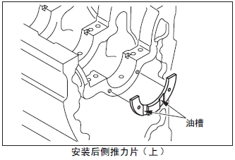 (1) 后側(cè)推力片( 上)的油槽面朝發(fā)動機后側(cè),對準曲軸箱最后端的定位銷位置后安裝。
