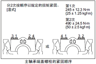 (6) 除曲軸最后端部以外的主軸承端蓋螺栓按照圖示順序,按照規(guī)定扭矩緊固。