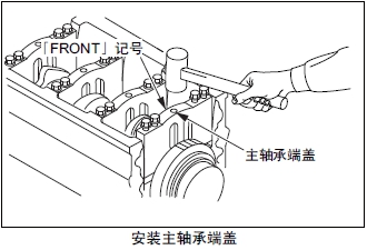 (2) 安裝時,主軸承端蓋上的刻印編號按發(fā)動機前側(cè)向后側(cè)的順序,另外,端蓋「FRONT」記號浮刻的側(cè)面朝向發(fā)動機前側(cè)的方向( 嵌槽都在同側(cè))。