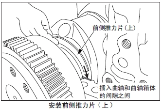 (2) 前側(cè)推力片( 上)的油槽面朝發(fā)動機的前側(cè),在曲軸和曲軸箱的空隙之間插入前側(cè)推力片( 上)。