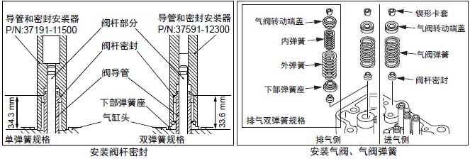 注: 雙彈簧規(guī)格時,進氣側(cè)和排氣側(cè)的零件構(gòu)成不同,注意不要裝錯。