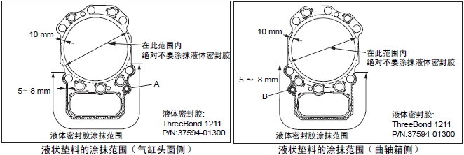 (2) 在氣缸頭墊片兩面的套筒孔和潤滑油通路周圍薄薄涂抹液狀墊料。液狀墊料的涂抹范圍,在氣缸頭墊片外周的5 ~ 8 mm,厚度0.2 ~ 0.5 mm。詳細(xì)涂抹范圍參考右圖。