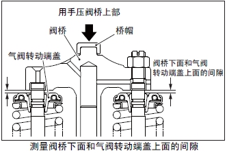 用手按壓閥橋,使和閥桿上端面接觸,檢測閥橋下面和氣閥轉(zhuǎn)動端蓋上面的間隙。間隙超過標(biāo)準(zhǔn)值范圍時,確認(rèn)故障的部件后更換新品。