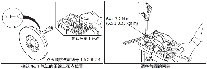 注: 這時,如果No.1 氣缸的進排氣氣閥間隙都為規(guī)定值的話,氣閥沒有被壓下。如果在排氣上死點附近時,氣閥被壓下。