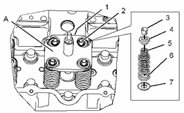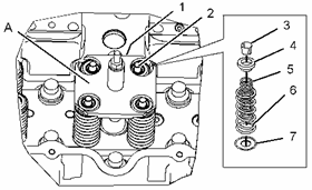用工具 (A) 壓縮進(jìn)氣門彈簧 (5) 和排氣門彈簧 (6) 。 在氣門 (2) 上安裝氣門彈簧卡座 (3) 。 拆下單體噴油器擋圈 (1) 和工具 (A) 。