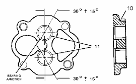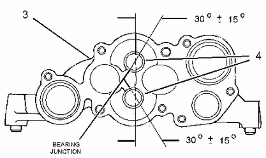 使用工具 (B) ,將套筒軸承 (4) 安裝到泵體 (3) 中。 軸承接頭應(yīng)距兩個軸承孔中心線 30 ± 15 度。 安裝套筒軸承,使套筒軸承與泵體的外側(cè)齊平。