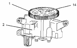 將驅(qū)動齒輪 (1) 安裝在發(fā)動機(jī)機(jī)油泵 (2) 泵軸上。 安裝螺栓 (14) 。 擰緊螺栓至扭矩為 55 ± 10 N·m (41 ± 7 lb ft)。