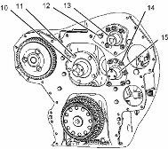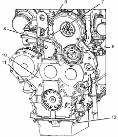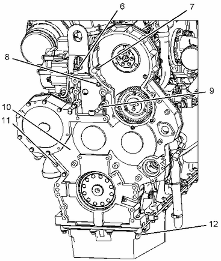 檢查凸輪軸齒輪與可調節(jié)惰輪齒輪組件之間的齒隙。 此齒隙應為 0.356 ± 0.254 mm (0.014 ± 0.010 in)。 參考測試和調整, "齒輪總成(前)- 正時",以了解齒隙調整步驟。擰緊螺母 (12) 和螺栓至扭矩為 55 ± 10 N·m (41 ± 7 lb ft)。