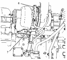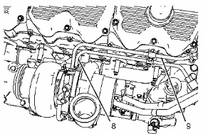 從渦輪增壓器上拆卸冷卻液供應(yīng)管(8)和冷卻液排放管(9)。檢查管路內(nèi)是否堆積有碎屑或污染物。如果發(fā)現(xiàn)管路內(nèi)有碎屑,確定污染物的來源。必要時修理冷卻系統(tǒng)。