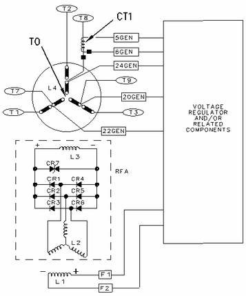 卡特彼勒SR4B 發(fā)電機(jī)自勵(lì)磁發(fā)電機(jī)配線圖 (CR1-C6) 二級(jí)管 (CR7) 變阻器 (L1) 勵(lì)磁機(jī)磁場(定子) (L2) 勵(lì)磁機(jī)電樞(轉(zhuǎn)子) (L3) 主磁場(轉(zhuǎn)子) (L4) 主電樞(定子) (RFA) 旋轉(zhuǎn)磁場總成 (CT1) 選裝的電壓降變壓器 (T0、T1、T2、T3、T7、T8、T9) 發(fā)電機(jī)端子 |