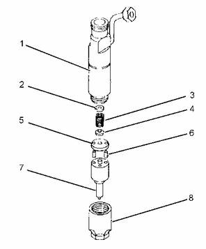 噴油嘴組件 (1)支架組件 (2)墊片 (3)壓力彈簧 (4)壓力銷 (5)密封墊 (6)銷 (7)噴油嘴 (8)固定螺母 |