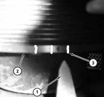 順時針緩慢轉(zhuǎn)動曲軸,使在步驟8中作的減振器或皮帶輪(2)上的標(biāo)記與指針(1)的尖部對齊。此時1號活塞位于壓縮沖程上止點。參考圖2和圖3。