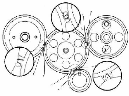 卡特彼勒3064/6發(fā)動(dòng)機(jī)正時(shí)齒輪 (1)惰輪 (2)凸輪軸齒輪 (3)噴油泵驅(qū)動(dòng)齒輪 (4)曲軸齒輪 |