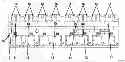 對(duì)缸體進(jìn)行了改動(dòng)以便能夠安裝較長(zhǎng)的缸蓋螺釘。以前的康明斯發(fā)動(dòng)機(jī)必須使用長(zhǎng)度為 171 mm [6.73 in] 的螺釘。現(xiàn)在的康明斯發(fā)動(dòng)機(jī)必須使用長(zhǎng)度為 203 mm [8.00 in] 的螺釘。短螺釘可用于維修。這些螺釘都是鍍鎘的(銀色或金色)。必須將這些短螺釘擰緊至 353 N•m [260 ft-lb]。如果短螺釘表面具有 lubrite 鍍層,而且顏色是黑色,則必須予以更換。203 mm [8 in] 螺釘只能使用 lubrite 鍍層。555 N•m [409 ft-lb] 扭矩必須施加在這些螺釘上。K50 康明斯發(fā)動(dòng)機(jī)總是使用 203 mm [8.00 in] 螺釘。