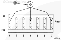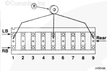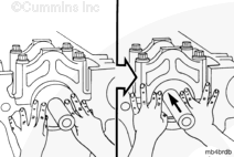 K38 康明斯發(fā)動(dòng)機(jī)上的主軸承蓋編號(hào)到“7”,而 K50 康明斯發(fā)動(dòng)機(jī)上則編號(hào)到“9”。將每個(gè)蓋安裝到正確位置中?!?”號(hào)蓋安裝在缸體前部。蓋中的軸承定位舌槽必須位于缸體中的槽的同一側(cè)。 |