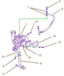注:回油管組件(9)上法蘭需用6mm調(diào)整螺釘(8)固定到渦輪增壓器(1)上。回油管組件(9)下法蘭需用8mm調(diào)整螺釘(11)固定到缸體上。