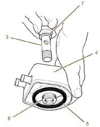 4.拆下調(diào)整螺釘(7)。從殼體(3)拆卸發(fā)動機機油冷卻器(2)和油封(5)。棄置油封(5)。