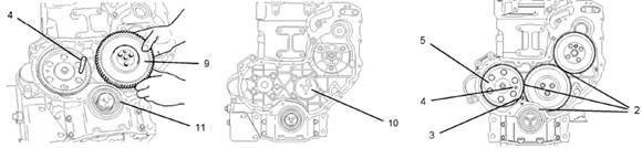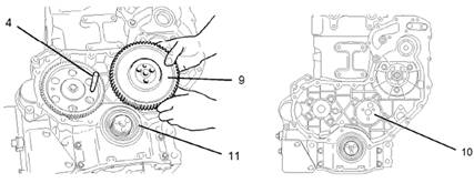 6.從缸體凹槽(10)中拆下惰齒輪(8)的組件(9)。向前移動(dòng)組件時(shí),必須將組件(9)吊到曲軸前油封(11)殼體的上方。