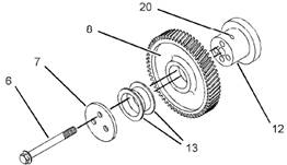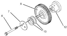 7.解體惰齒輪(8)的組件(9)和輪轂。為了解體標(biāo)準(zhǔn)組件(9),將輪轂(12)滑出惰齒輪(8).檢查惰齒輪(8)中的襯套(13)有無(wú)磨損或損壞。如有必要,從惰齒輪(8)的每側(cè)拆下襯套(13)。