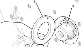 2.將一層少量、連續(xù)的(11)21820603POWERPARTRetainer(耐油)涂到軸承(9)的外表面上。將前殼體(6)的前法蘭放置到一個(gè)合適的支座上。按壓軸承(9)的外座圈,直至軸承靠到前殼體(6)中軸承的凹口前面。清除所有多余的密封膠。