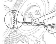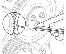 10.檢查惰齒輪和曲軸齒輪之間的齒隙。更多信息,請(qǐng)參閱《技術(shù)參數(shù)手冊(cè)》,“前齒輪總成”。