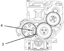 2.確保1號(hào)氣缸仍處在其壓縮沖程的上止點(diǎn)位置。如有必要,請(qǐng)參閱《Perkins1103/1104柴油發(fā)動(dòng)機(jī)測(cè)試和調(diào)整手冊(cè)》,“查找1號(hào)活塞的上止點(diǎn)位置”。確保安裝了曲軸正時(shí)銷(3)和凸輪軸正時(shí)銷(4)。