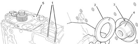 1.徹底清潔缸體上前齒輪室的配合面。將兩個(gè)臨時(shí)用雙頭螺柱(1)裝入缸體中。確保止推墊圈(2)與空心定位銷(3)對(duì)齊。將止推墊圈安裝到凸輪軸(4)上。將新的接頭(5)安裝到缸體上。