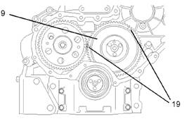 注:組裝惰齒輪和輪轂的組件(9)時(shí),確保惰齒輪(8)上的標(biāo)記(19)朝向發(fā)動(dòng)機(jī)前端。