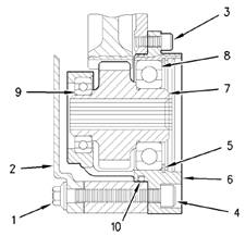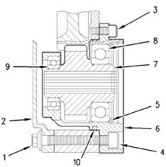 4.將前殼體(6)的法蘭盤放置到一個(gè)合適的支座上。從前殼體(6)推壓出齒輪(7)以及軸承(8和9)的組件。為了從齒輪(7)拆下軸承(8和9),使用一個(gè)合適的拉拔器。