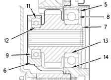 4.將一層少量、連續(xù)(14)的21820603POWERPARTRetainer(耐油)涂到軸承(8)的外表面上。將一層少量、連續(xù)(13)的21820603POWERPARTRetainer(耐油)涂到軸承(8)的內(nèi)表面上。確保軸承(9)內(nèi)座圈的前面仍在一個(gè)合適的支座上。將軸承(8)按壓到齒輪(7)的較大軸上,直至軸承(9)靠到齒輪的肩上。清除所有多余的密封膠。