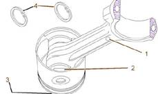 3.將連桿的標(biāo)記(1)與活塞的凸臺(tái)切口(2)對(duì)齊。還要檢查確認(rèn)活塞頂部標(biāo)記的箭頭(3)對(duì)齊。將活塞銷安裝到活塞中并穿過連桿。
