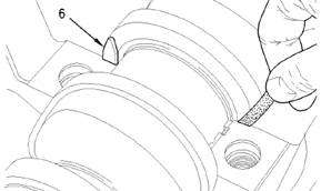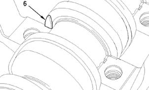 10.用清潔的發(fā)動機機油輕輕潤滑上止推墊圈(6)。將上止推墊圈(6)安裝到缸體中相應主軸承的每側(cè)。上部止推墊圈(6)中的凹槽必須抵到曲軸上。如有必要,將曲軸移至前部或后部,以安裝止推墊圈(6)。