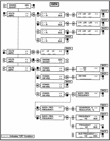 下一頁顯示了發(fā)電機(GEN)功能的方框圖,如果按下顯示屏上“GEN”(發(fā)電機)附近的按鍵,將出現(xiàn)第1個發(fā)電機子功能。如圖所示,發(fā)電機(GEN)功能下面又分為三個子功能。