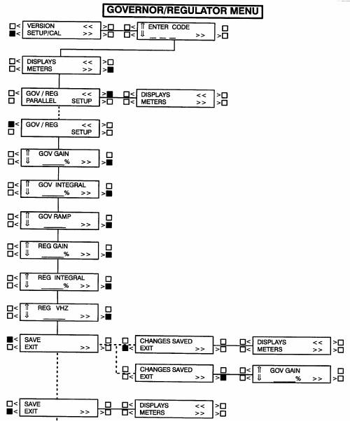 下一頁為調(diào)速器/調(diào)壓器(GOV/REG)子功能的方框圖,這是4項設(shè)定/標(biāo)定(SETUP/CAL)功能中的第3項子功能。如果按主功能中“>>”符號旁邊的按鍵,將顯示版本/設(shè)定/標(biāo)定(VERSION/SETUP/CAL)子功能。