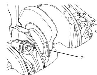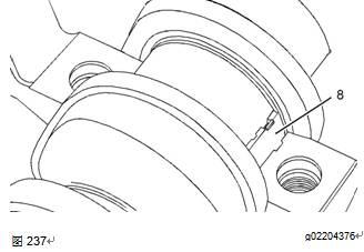 4對于6號主軸瓦,確保兩個(gè)止推墊圈(7)清潔且無磨損或損壞。如有必要,更換止推墊圈。使用清潔的發(fā)動機(jī)機(jī)油潤滑止推墊圈(7)。將止推墊圈(7)在曲軸與缸體之間滑動到位。確保定位凸舌正確座入缸體。