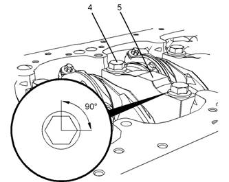 7.使用清潔的發(fā)動機(jī)機(jī)油潤滑螺栓(4)的螺紋。使用清潔的發(fā)動機(jī)機(jī)油潤滑螺栓(4)的端部底面。