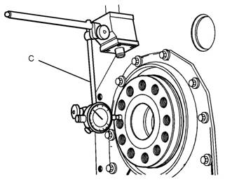 10檢查曲軸的軸向間隙。向發(fā)動機(jī)前部推動曲軸。將工具(C)安裝到缸體及曲軸后表面上。向發(fā)動機(jī)后部推動曲軸。使用工具(C)測量曲軸軸向間隙。曲軸允許的軸向間隙為0.10mm(0.004in)至0.41mm(0.016in)。