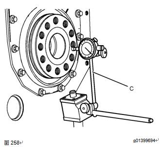 15.檢查曲軸的軸向間隙。向發(fā)動(dòng)機(jī)前部推動(dòng)曲軸。將工具(C)安裝到缸體及曲軸后表面上。向發(fā)動(dòng)機(jī)后部推動(dòng)曲軸。使用工具(C)測量曲軸軸向間隙。曲軸允許的軸向間隙為0.10mm(0.004in)至0.41mm(0.016in)。