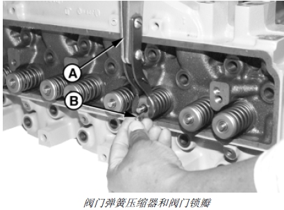 5. 用 JDE138 閥門彈簧壓縮器 (A) 壓縮閥門彈簧,并在閥桿上安裝閥門鎖瓣 (B)。