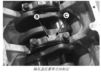 重要提示: 主軸瓦蓋一定要安裝在各自拆卸時(shí)的位置。軸瓦蓋上的數(shù)字 (B) 應(yīng)與機(jī)體油盤架上的數(shù)字上合。裝軸瓦蓋上的箭頭 (C) 必須指向汽缸體凸輪軸一側(cè)。