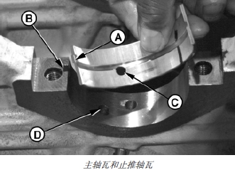 1. 安裝主軸瓦。軸瓦的榫塊 (A) 一定要插到軸瓦座和主軸瓦蓋的槽口 (B) 中。同時(shí),軸瓦的油孔 (C) 要與軸瓦座的油孔 (D) 對(duì)齊。