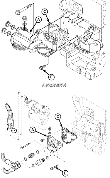 對(duì)于配備長(zhǎng)效過(guò)濾器的John Deere約翰迪爾強(qiáng)鹿柴油發(fā)動(dòng)機(jī):在內(nèi) (B) 外 (A) 密封和過(guò)濾器螺紋上涂一層干凈的機(jī)油。用干凈的布子擦拭集管的兩個(gè)密封面(D 和 E)。確保防塵密封 (C)位于集管的正確位置上,并且密封翼片要與蓋槽對(duì)齊。如果損壞,更換密封。安裝機(jī)油過(guò)濾器并用手?jǐn)Q緊,直到貼緊防塵密封墊。密封墊接觸后不得像安裝其他過(guò)濾器一樣再擰緊 1/2 - 3/4 圈。