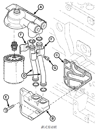 注意: 舊式John Deere約翰迪爾強(qiáng)鹿柴油發(fā)動(dòng)機(jī)的油管 (D) 是彎管轉(zhuǎn)接器 (A) 的一部分,且不使用 O 形環(huán) (E)。確保 O 形環(huán) (C) 正確安裝在正時(shí)齒輪蓋冷卻液端口的槽中。