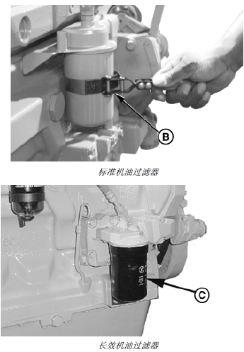 3. 使用合適的過(guò)濾器扳手拆卸機(jī)油過(guò)濾器(B 或 C)。