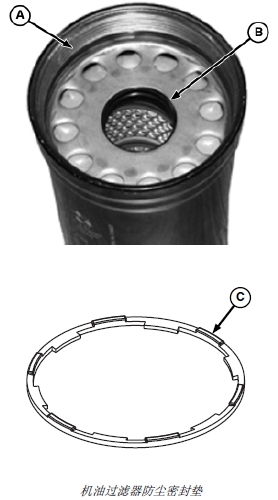 重要提示: 不得使用過(guò)濾器扳手安裝過(guò)濾器。只能用手安裝過(guò)濾器。對(duì)于裝配長(zhǎng)效過(guò)濾器的John Deere約翰迪爾強(qiáng)鹿柴油發(fā)動(dòng)機(jī),確保防塵密封的翼片 (C) 正確安裝在殼體槽中,然后安裝過(guò)濾器。