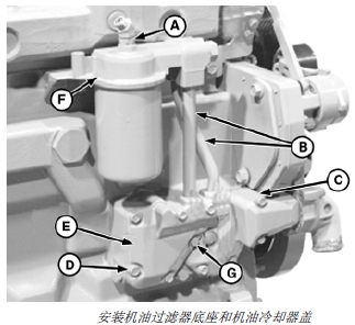 7. 安裝零部件(A、B、D、E 和 F)。(參見(jiàn)本章“拆卸、檢查和安裝機(jī)油過(guò)濾器底座”部分。)