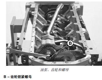 5. 從機(jī)油泵錐柄驅(qū)動(dòng)軸上拆下螺母 (B),拉出齒輪。拆卸機(jī)油泵齒輪時(shí),將螺母松開(kāi)幾圈,用撬杠插入前板和齒輪之間在齒輪兩側(cè)撬動(dòng)。如果用上述方法無(wú)法拆下齒輪,可松開(kāi)機(jī)油泵殼體帶帽螺釘,用小鉛錘敲軸頭的螺母使齒輪受力,直到齒輪從錐柄上退下。