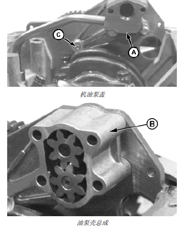 9. 拆卸下部機(jī)油泵殼體帶帽螺釘,擰下惰輪帶帽螺釘(C),然后拆下機(jī)油泵殼總成 (B)。